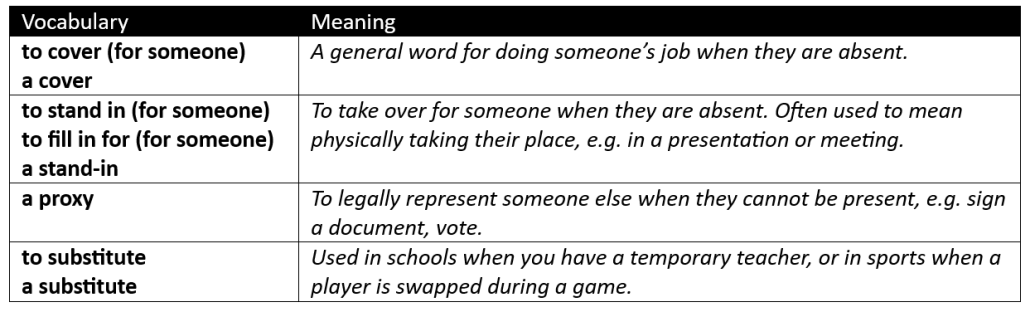 When you are sick or are on holiday, normally someone else will look after all or part of your work. There are a range of words or phrases that you can use to talk about this (and a few that you shouldn’t use).