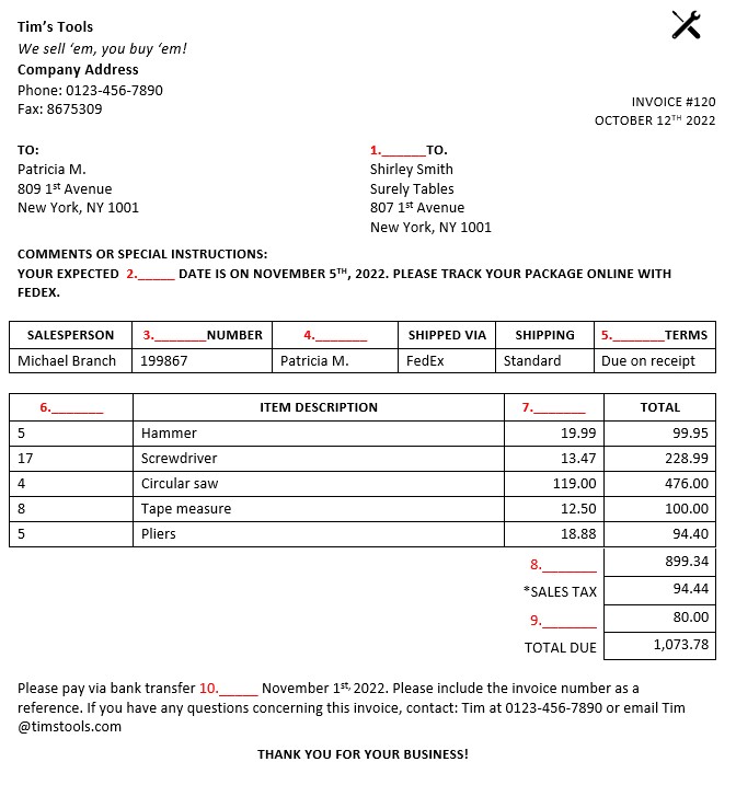 Look at the invoice below. There are some missing words. In the activity under the invoice, choose the most appropriate word for each number.